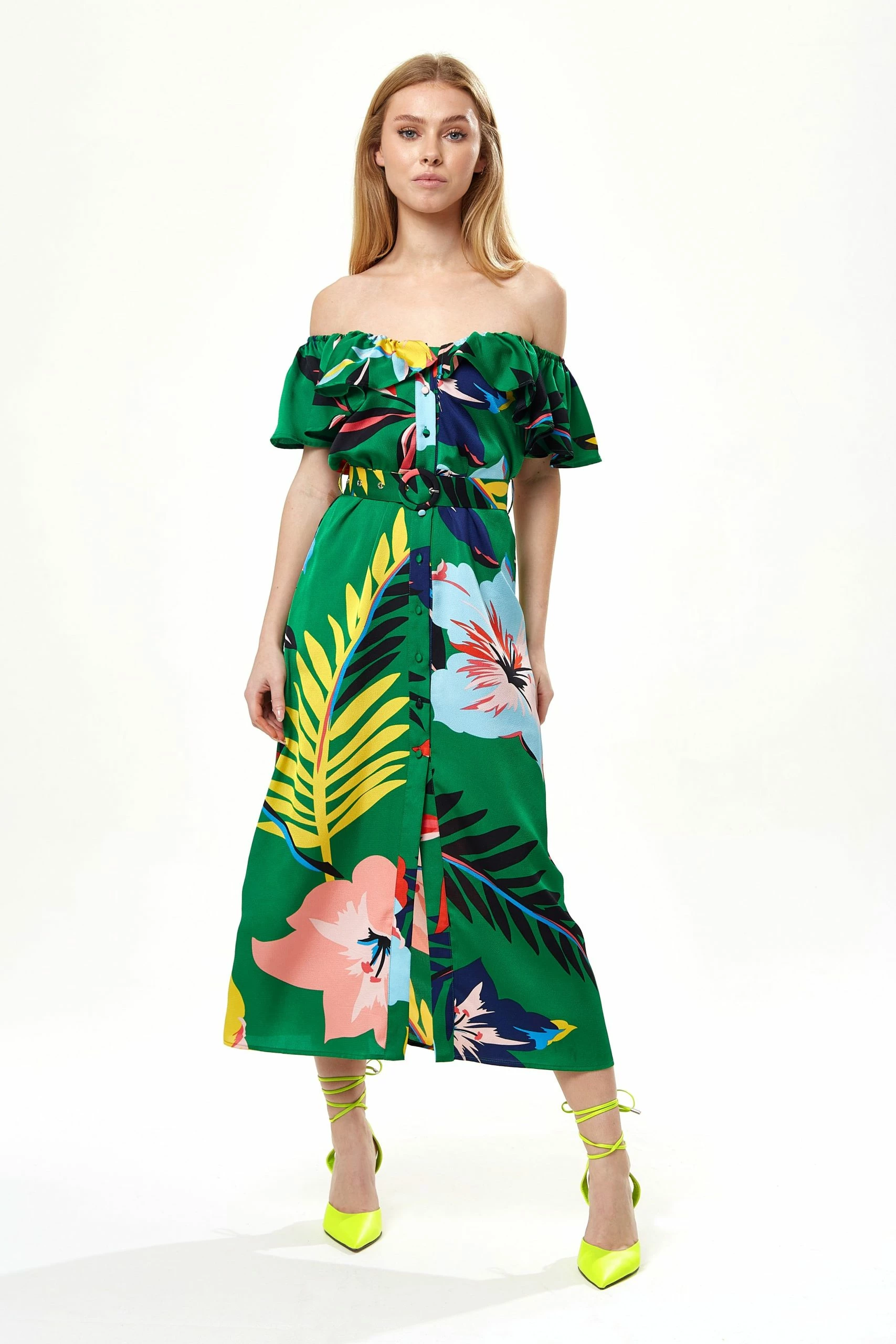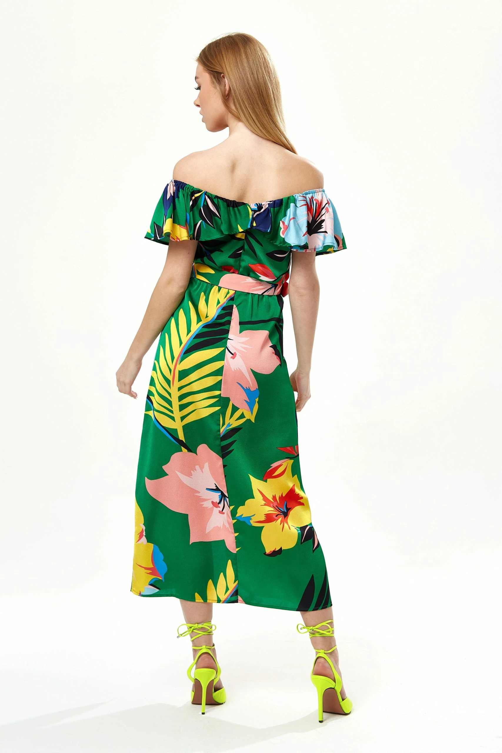 Liquorish Belted Midi Dress with Off Shoulder Sleeves in Green Floral Print