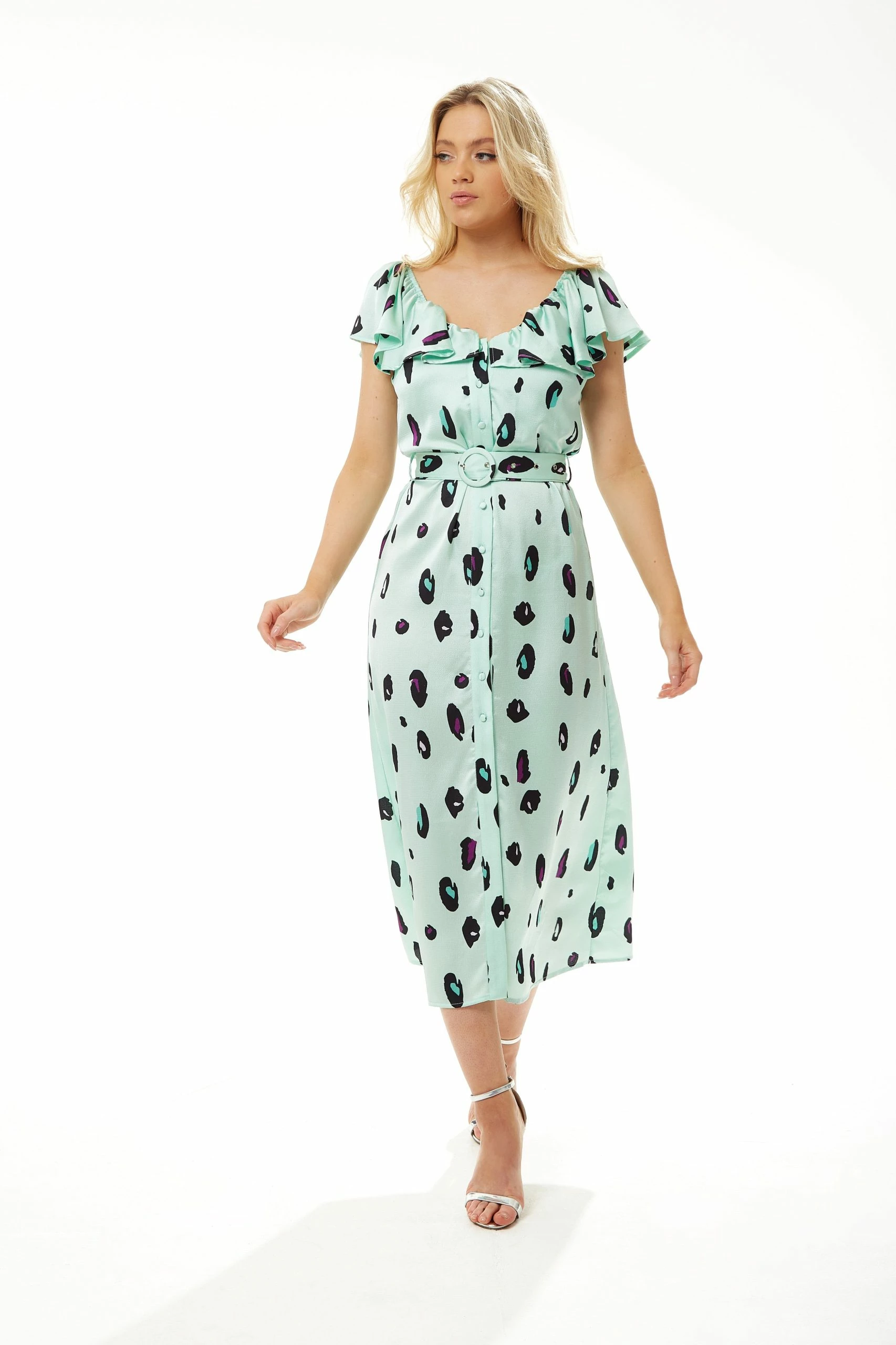 Liquorish Belted Midi Dress with Off Shoulder Sleeves in Mint Animal Print