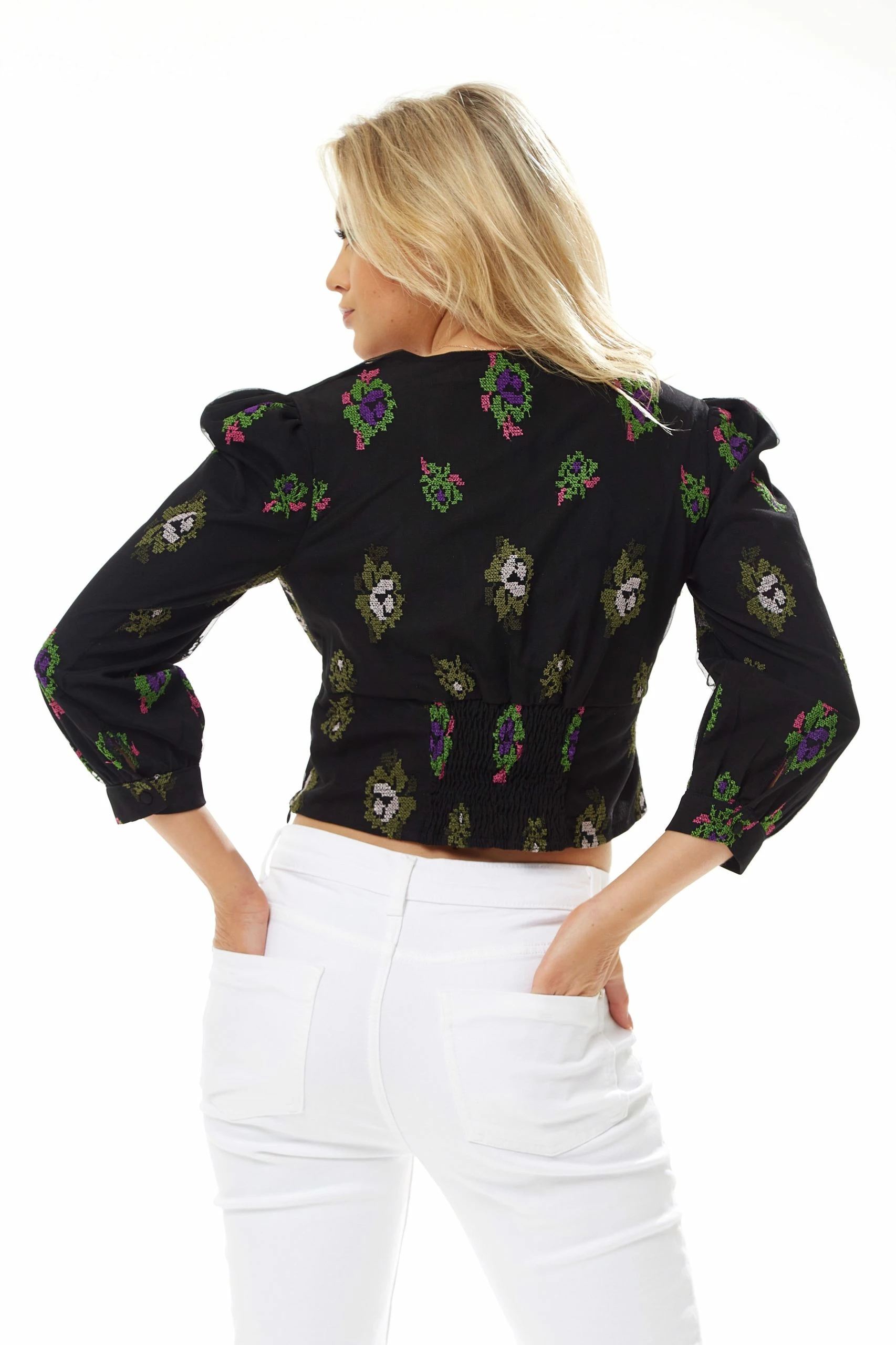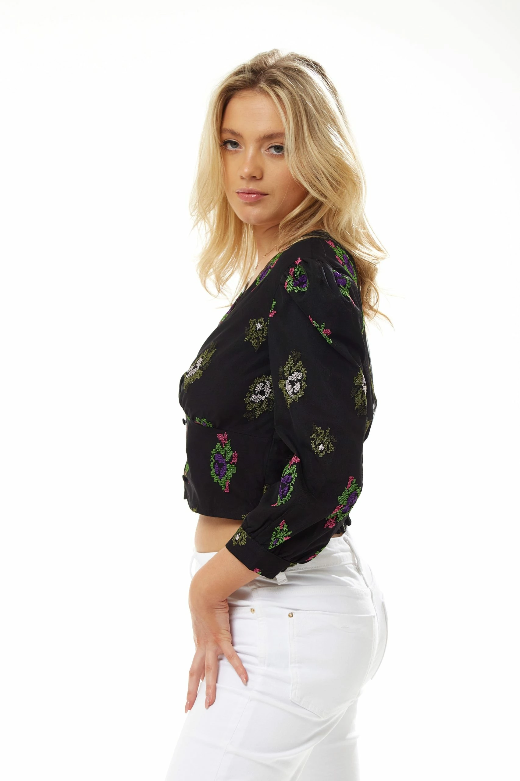 Liquorish Black Embriodered Top with Mesh Sleeves