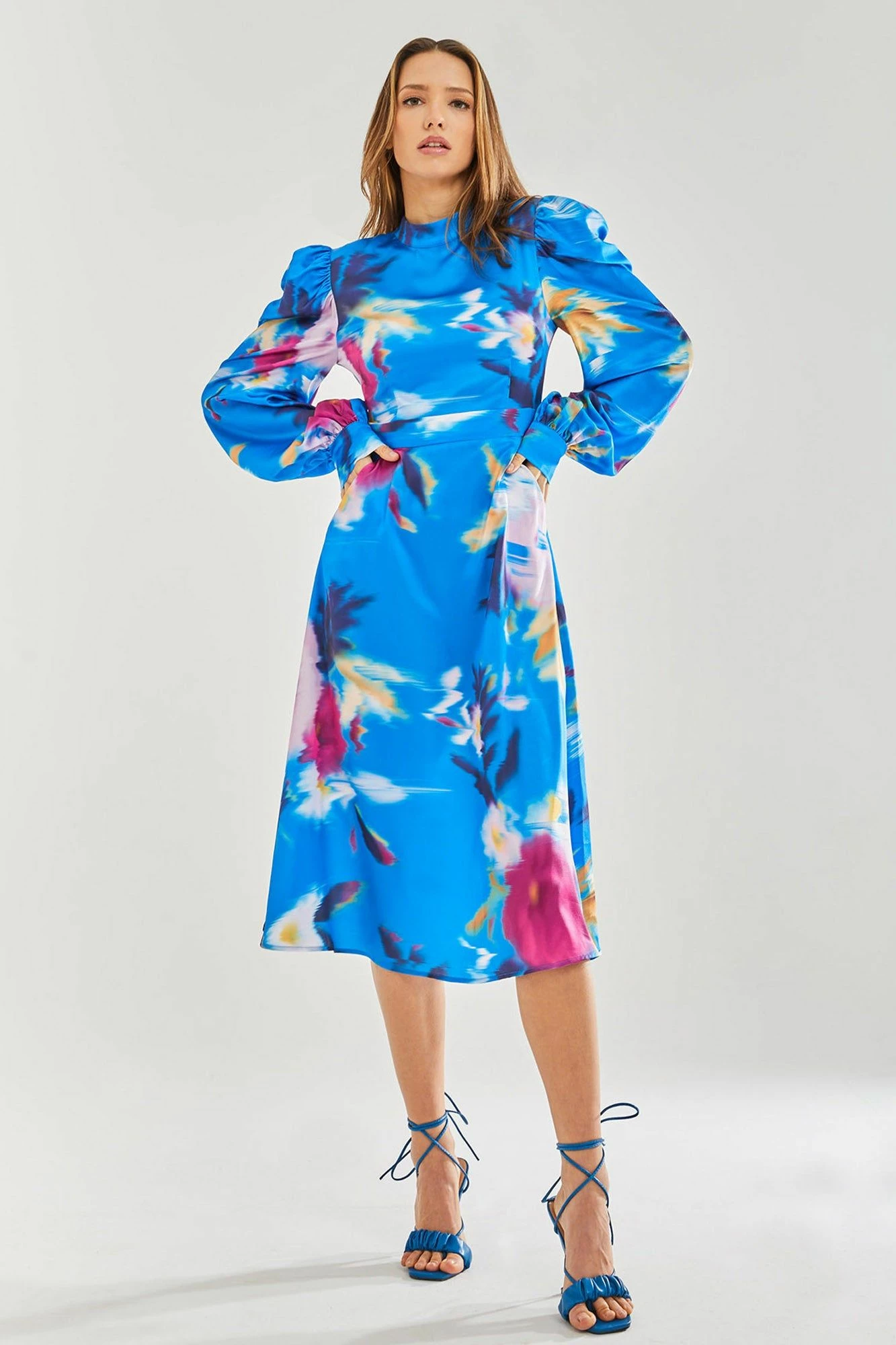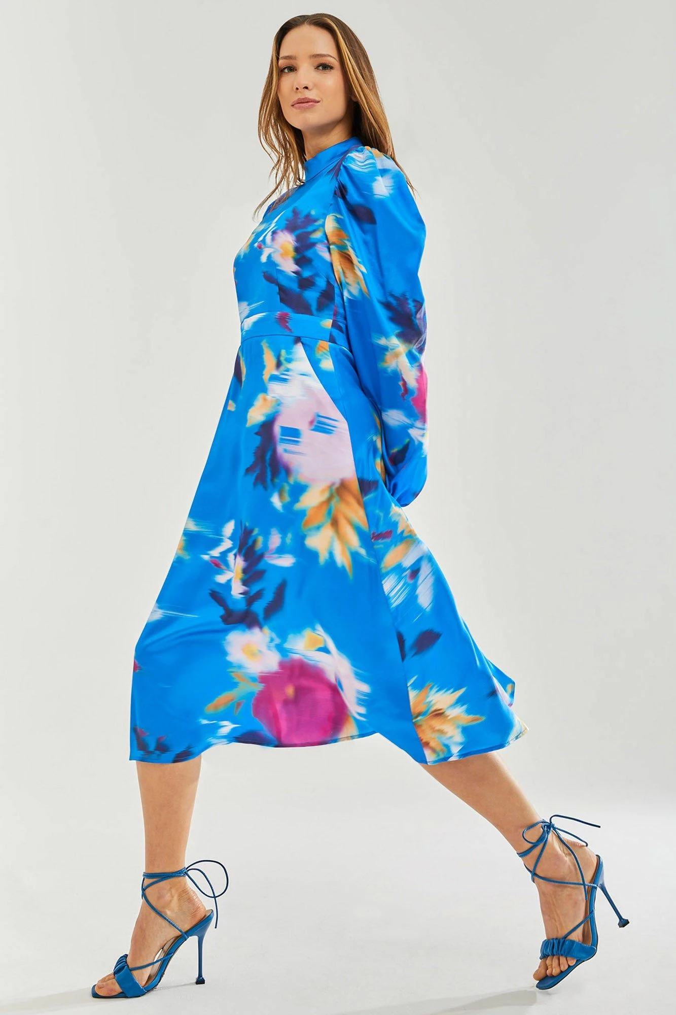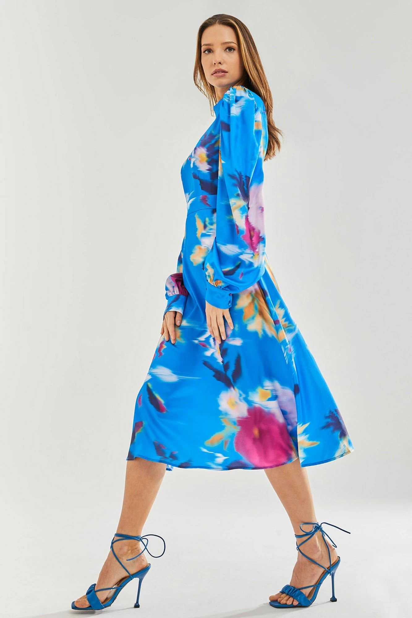 Liquorish Blue Floral Satin Cut Out Back Midi Dress
