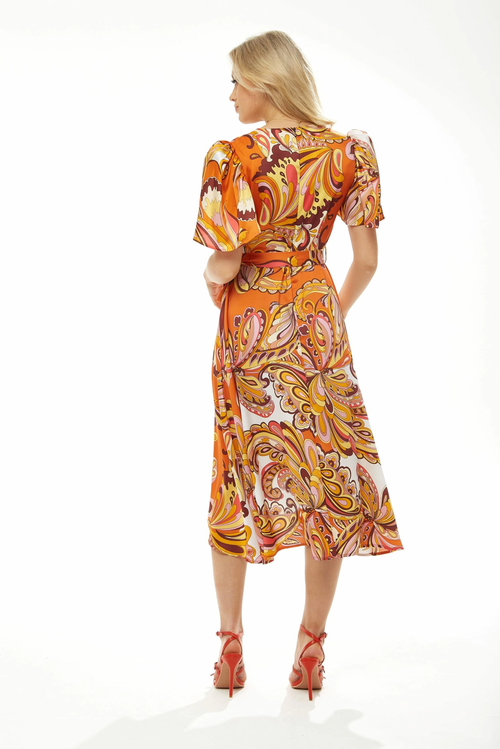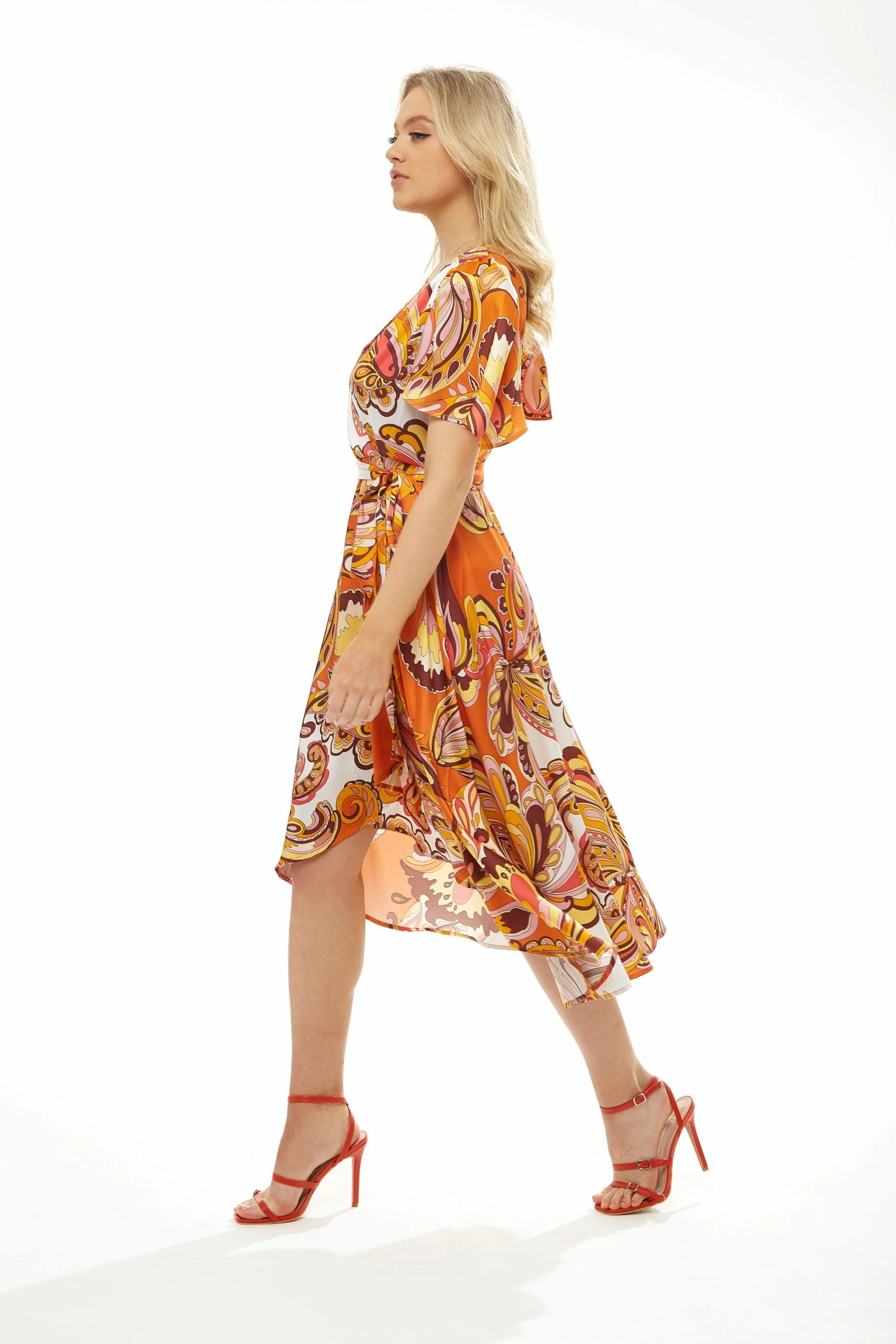 LIQUORISH FAKE WRAP MIDI DRESS IN ORNGE FLORAL