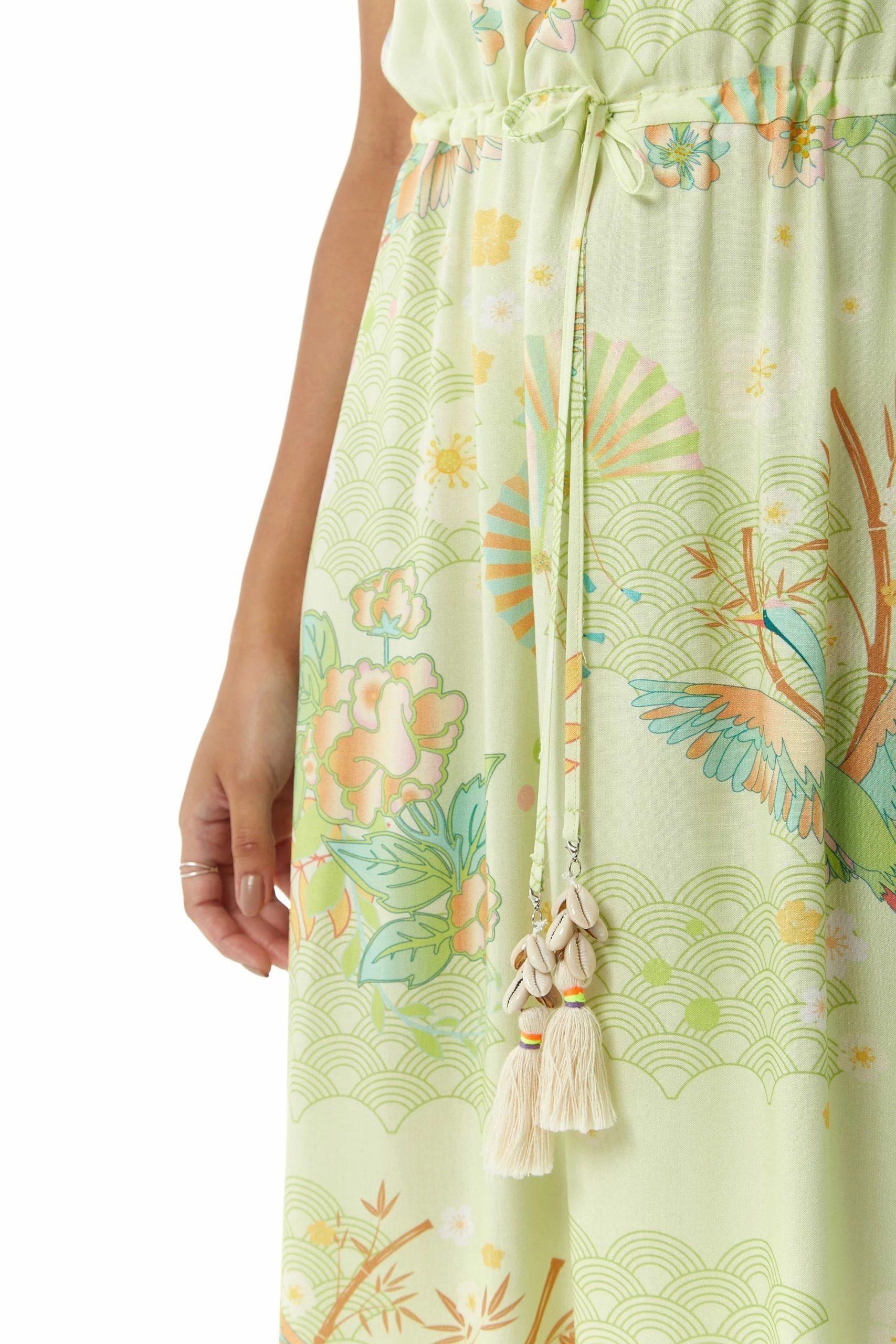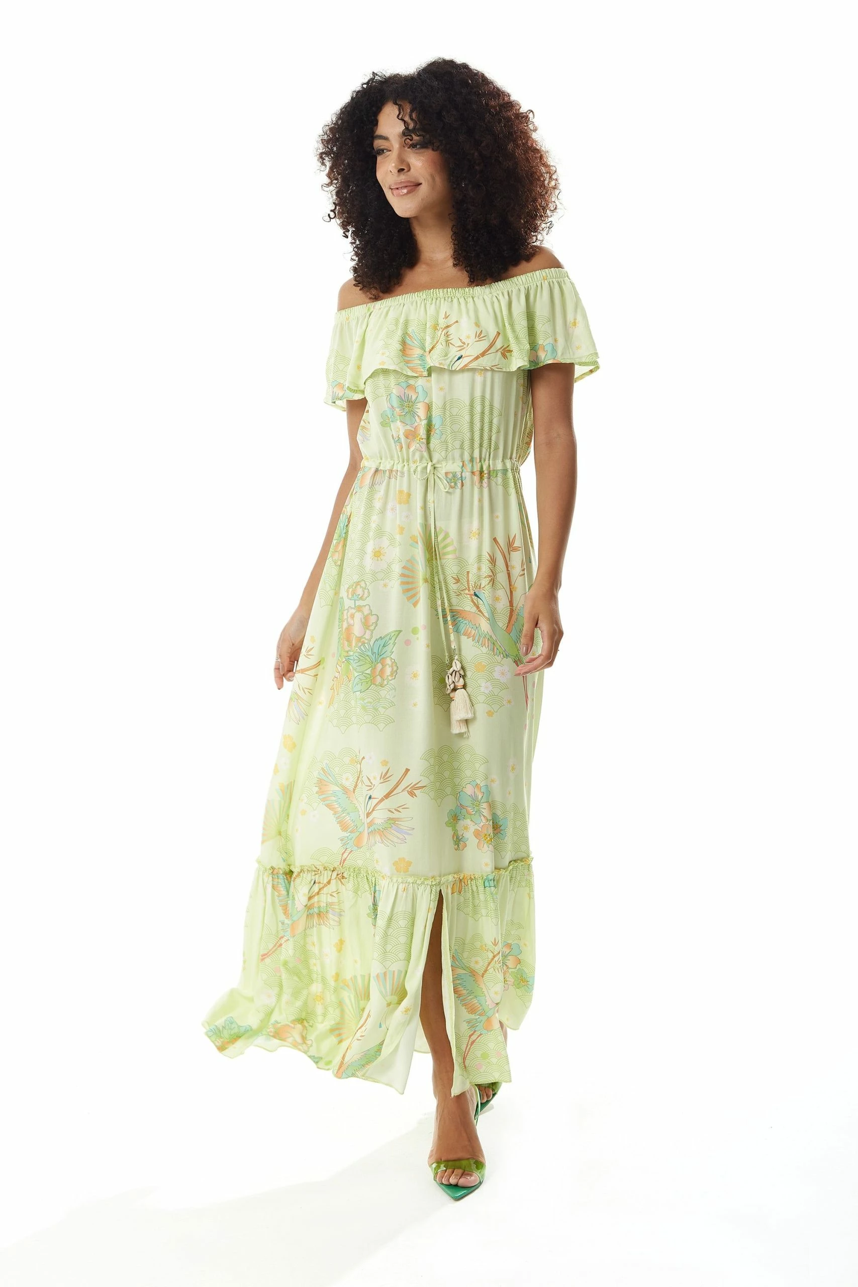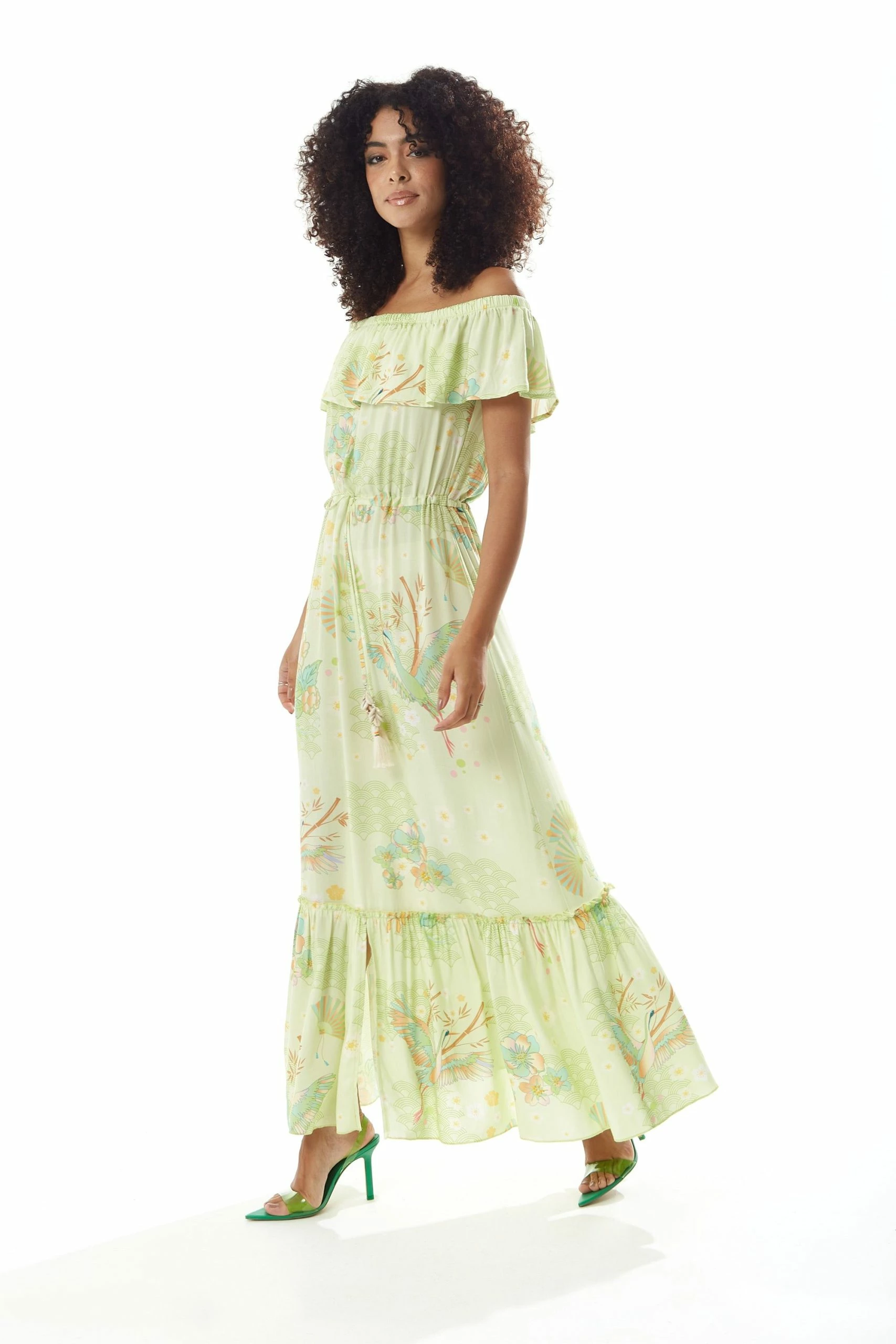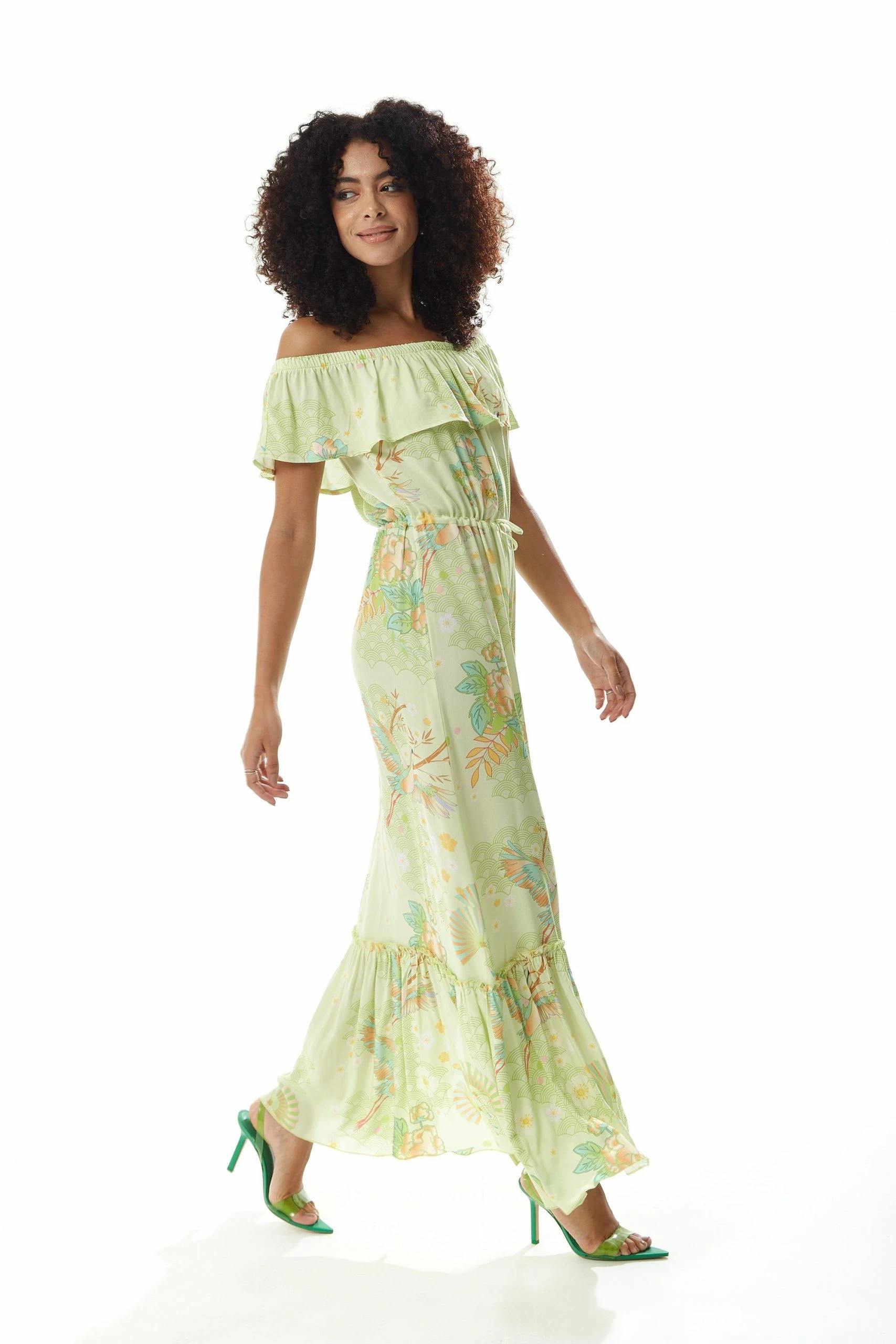 Liquorish Floral and Bird Print Off Shoulder Maxi Dress in Sage Green