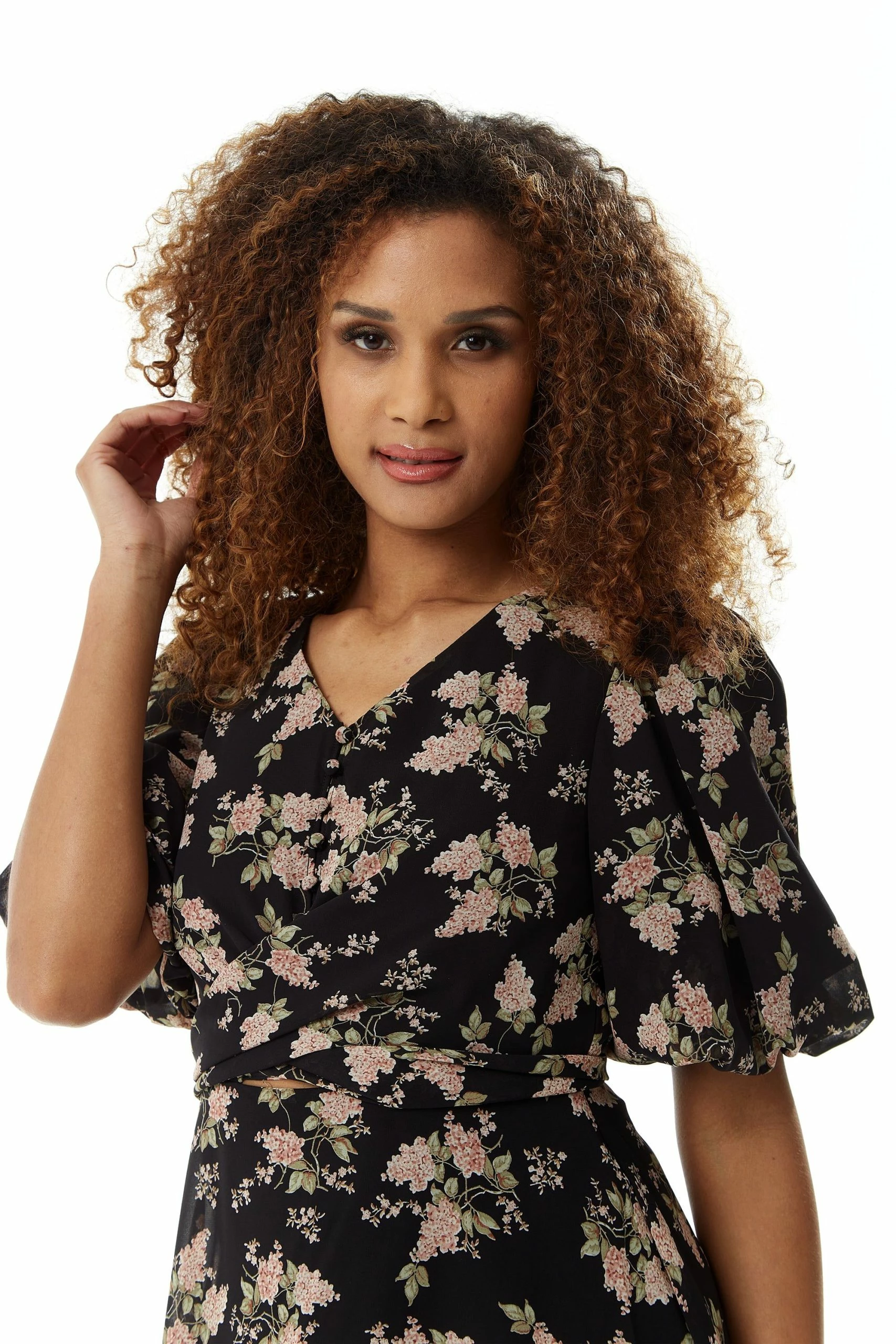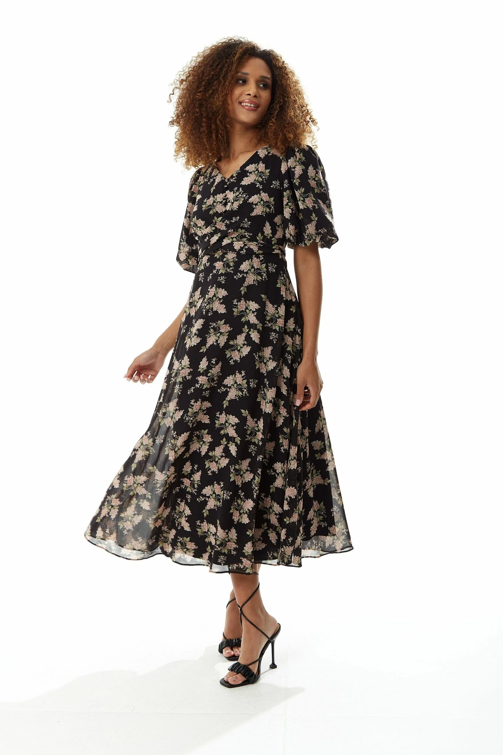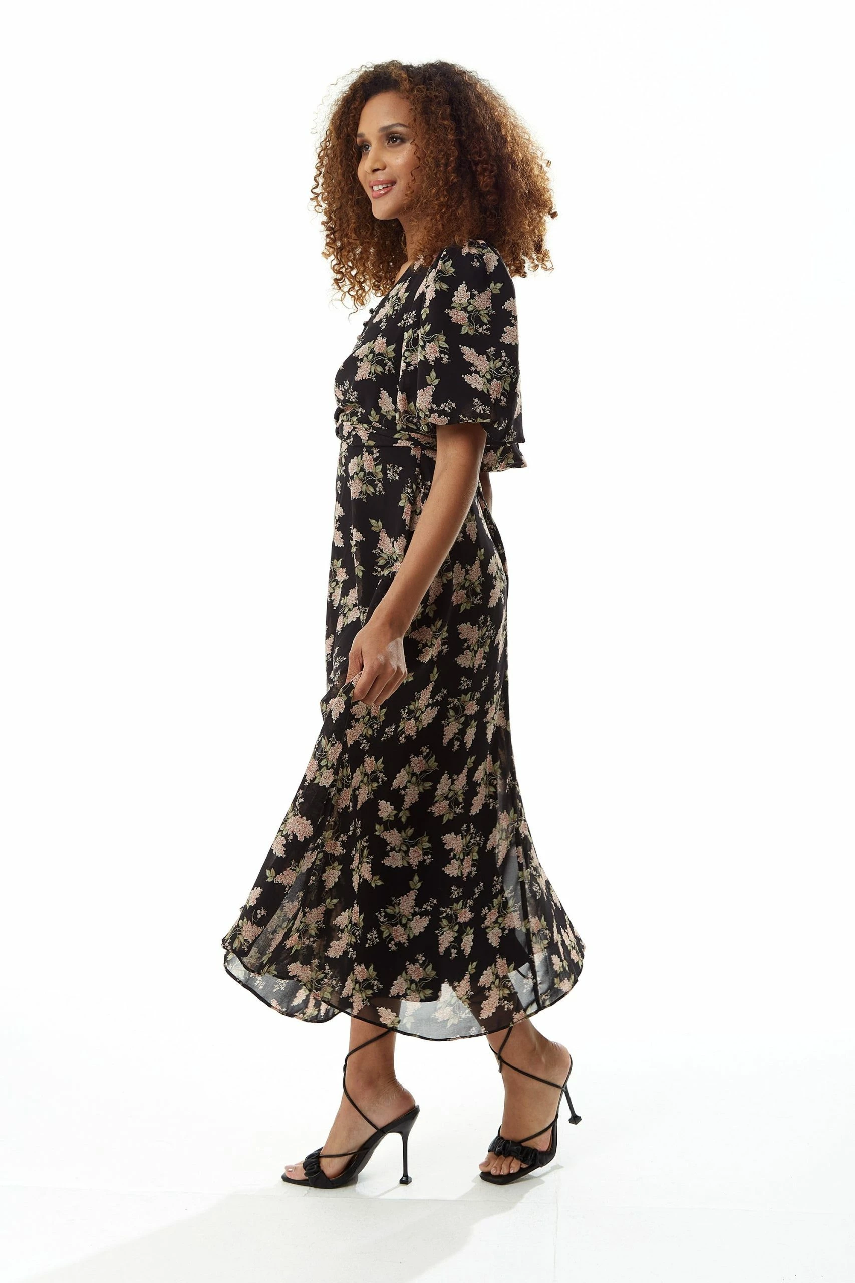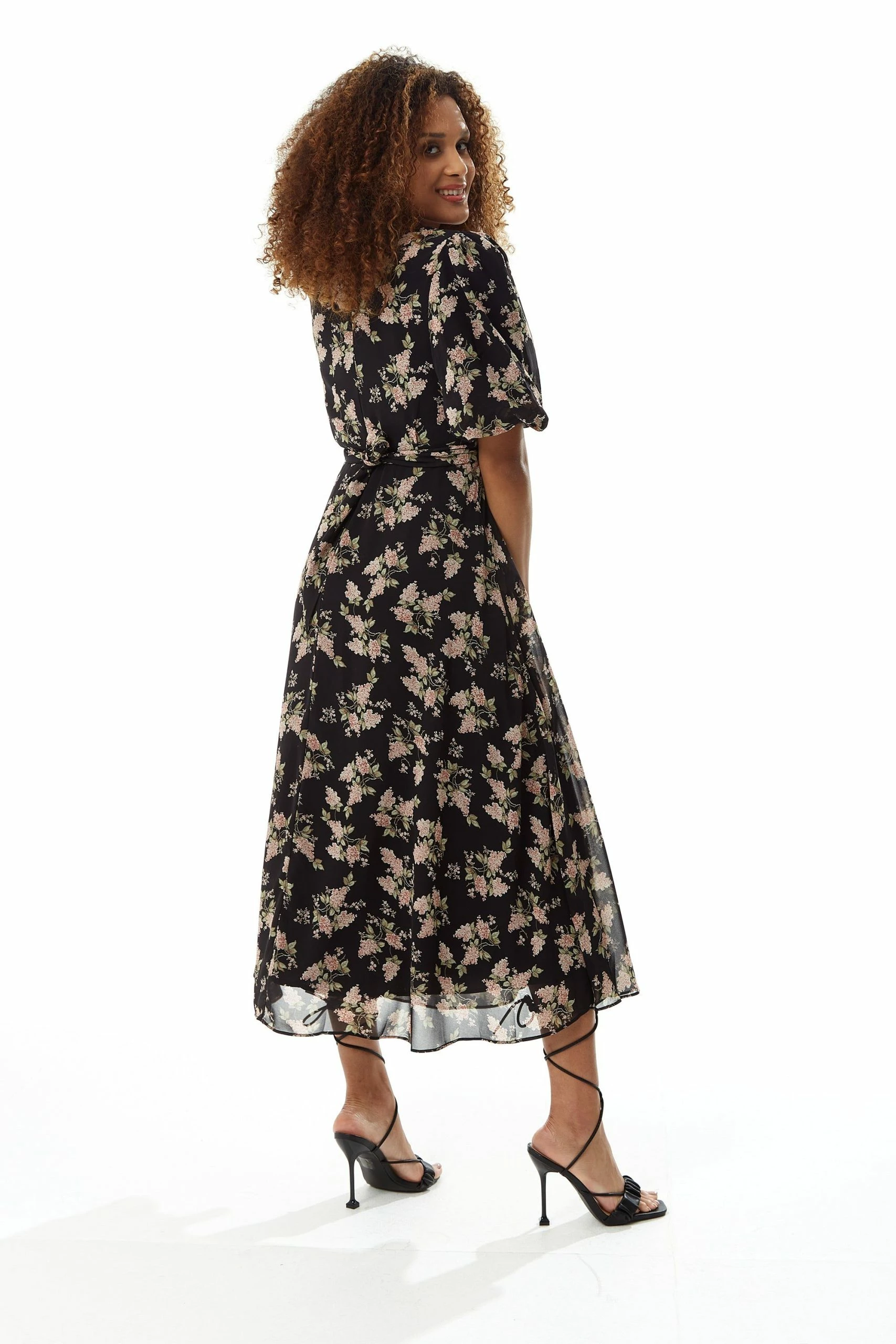 Liquorish Floral Midi Dress with Tie Waist in Navy