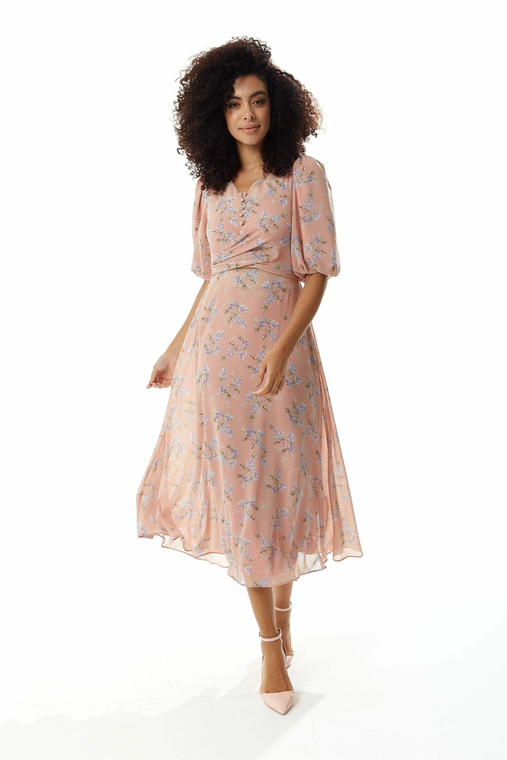 Liquorish Floral Midi Dress with Tie Waist in Pink