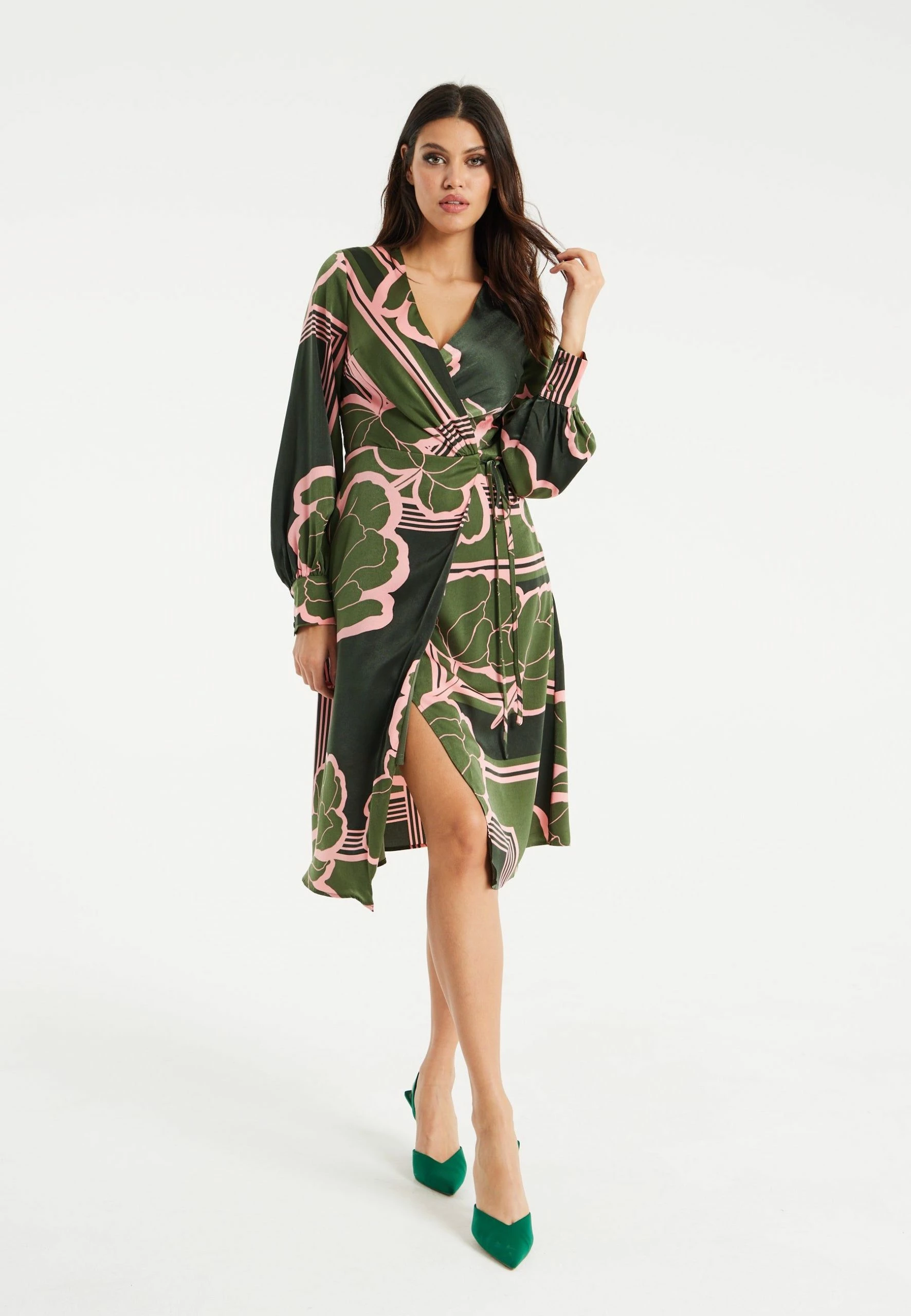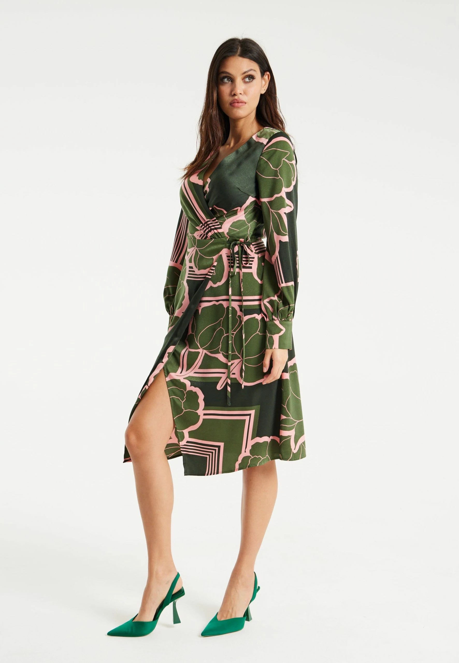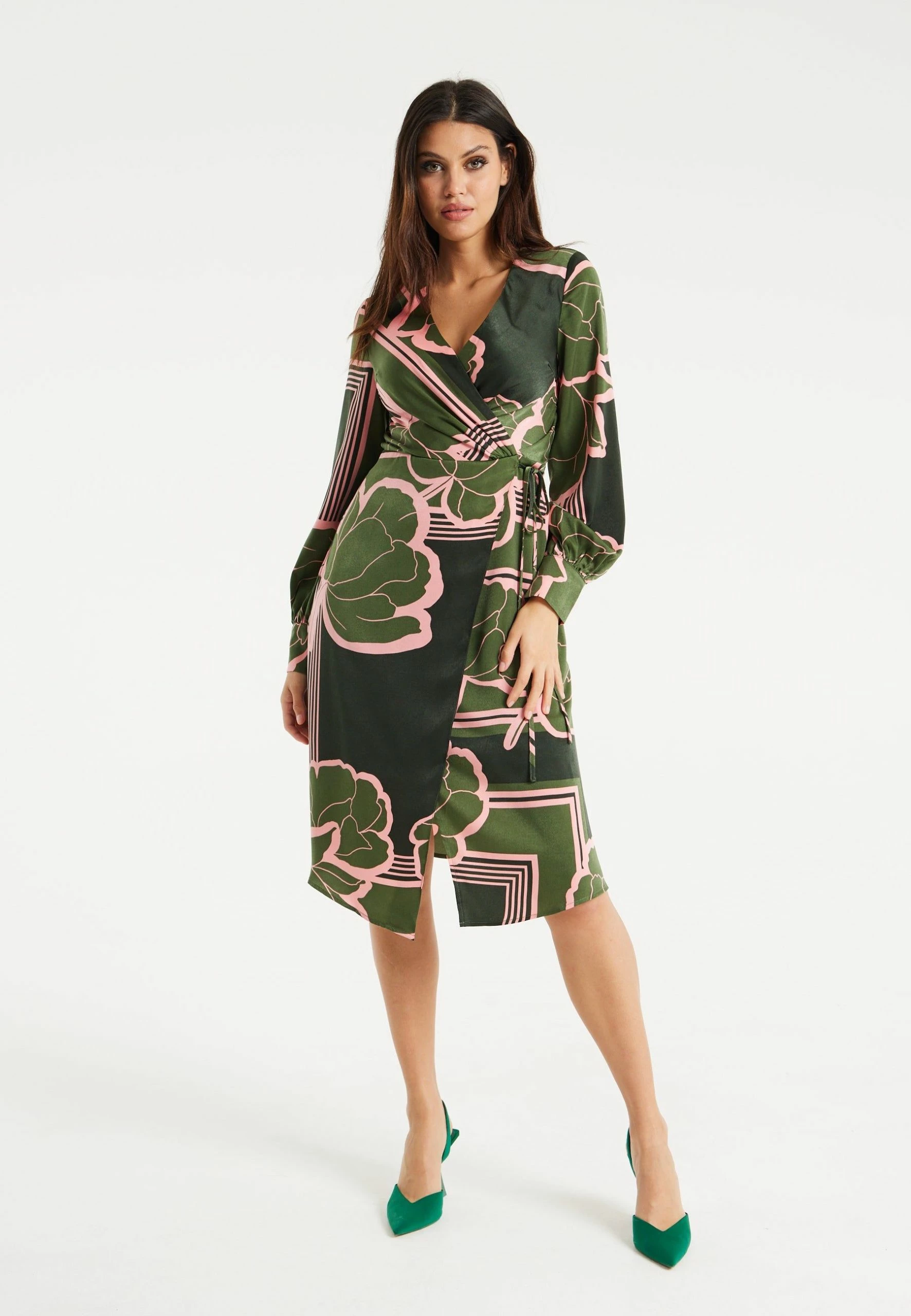 Geometric and floral print, Midi length, V neck, Long sleeves, Wrap style