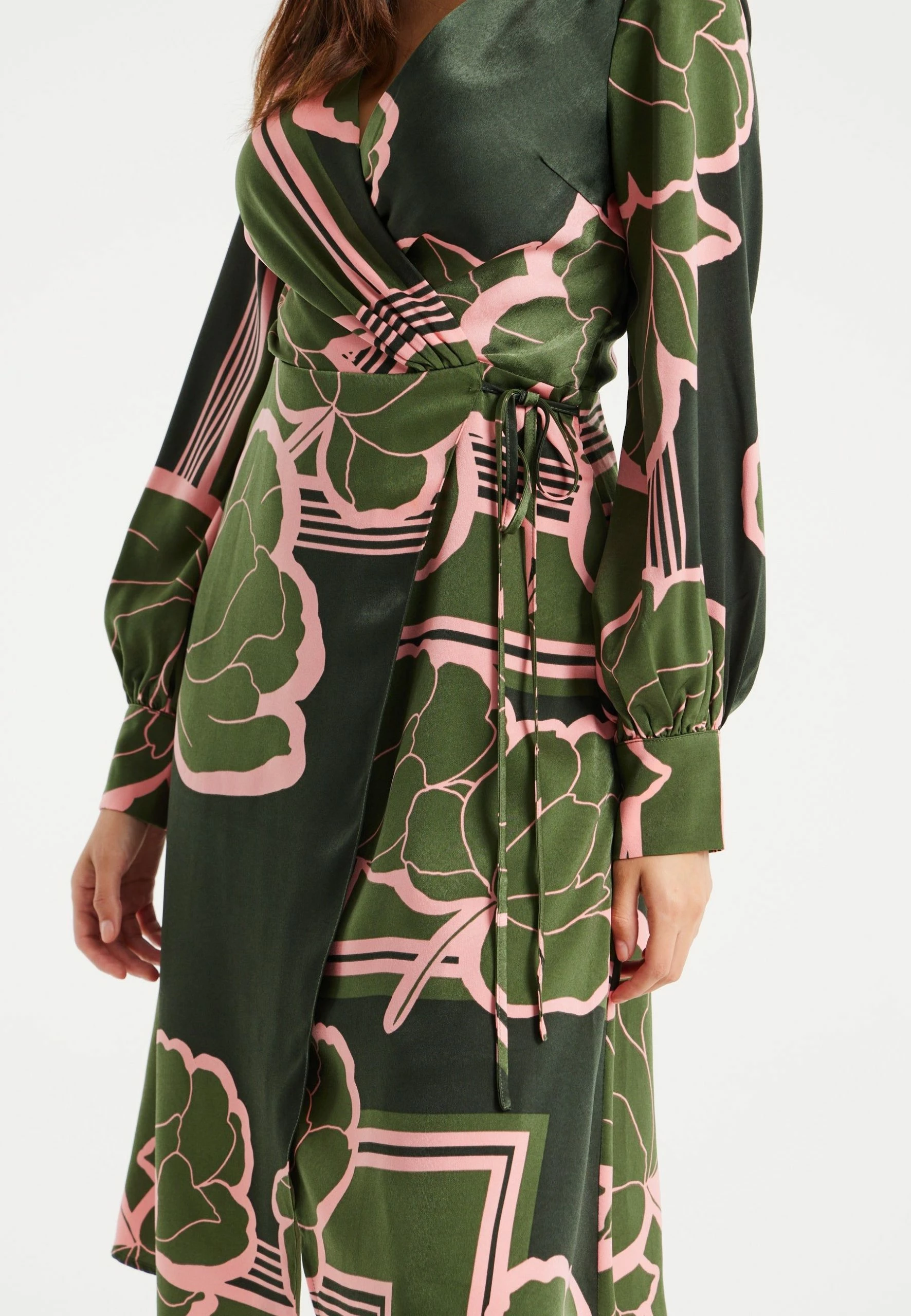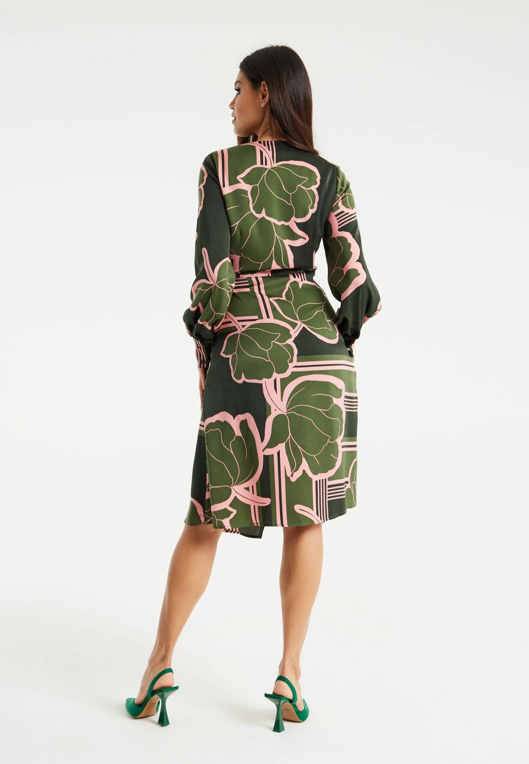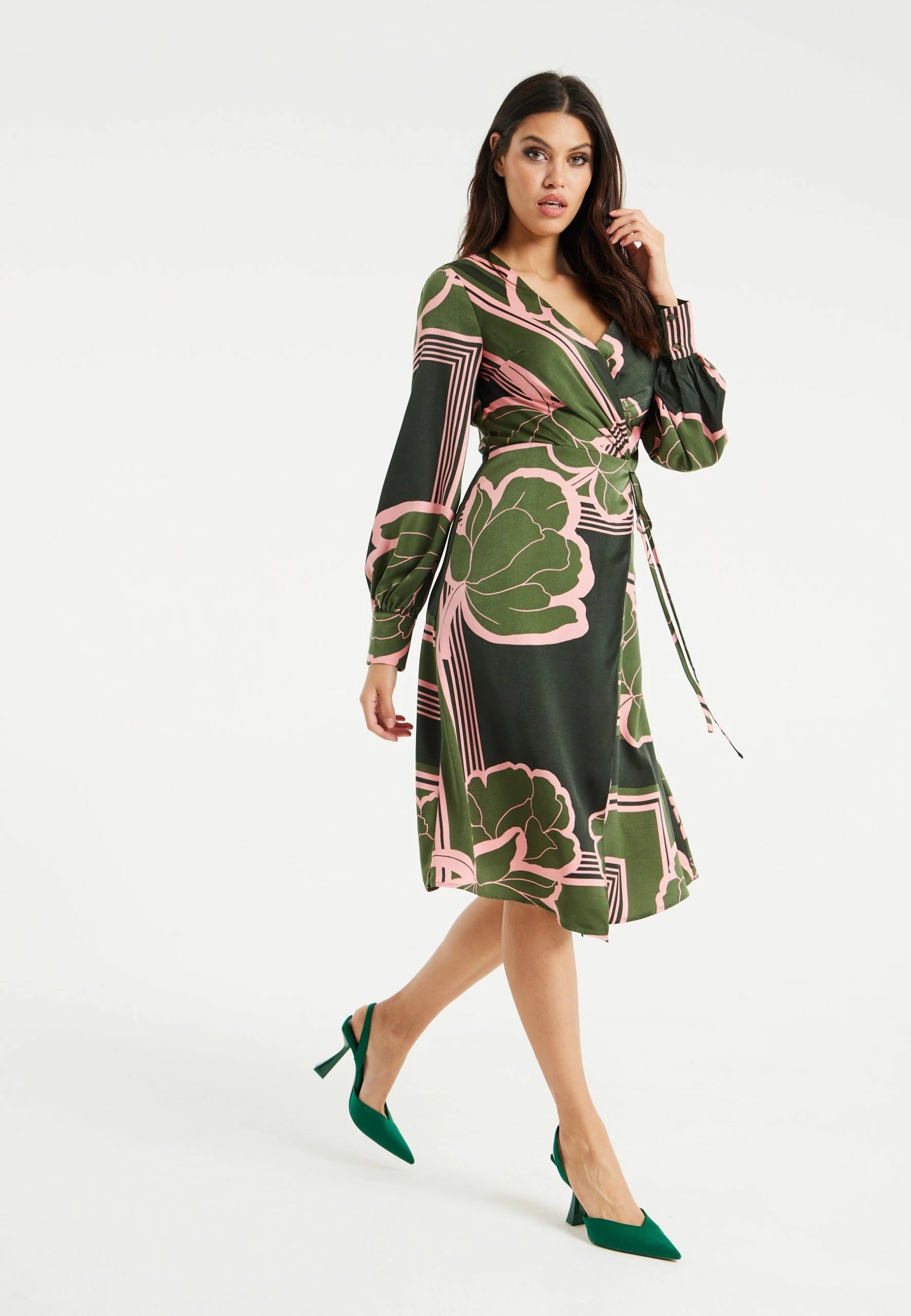 Geometric and floral print, Midi length, V neck, Long sleeves, Wrap style