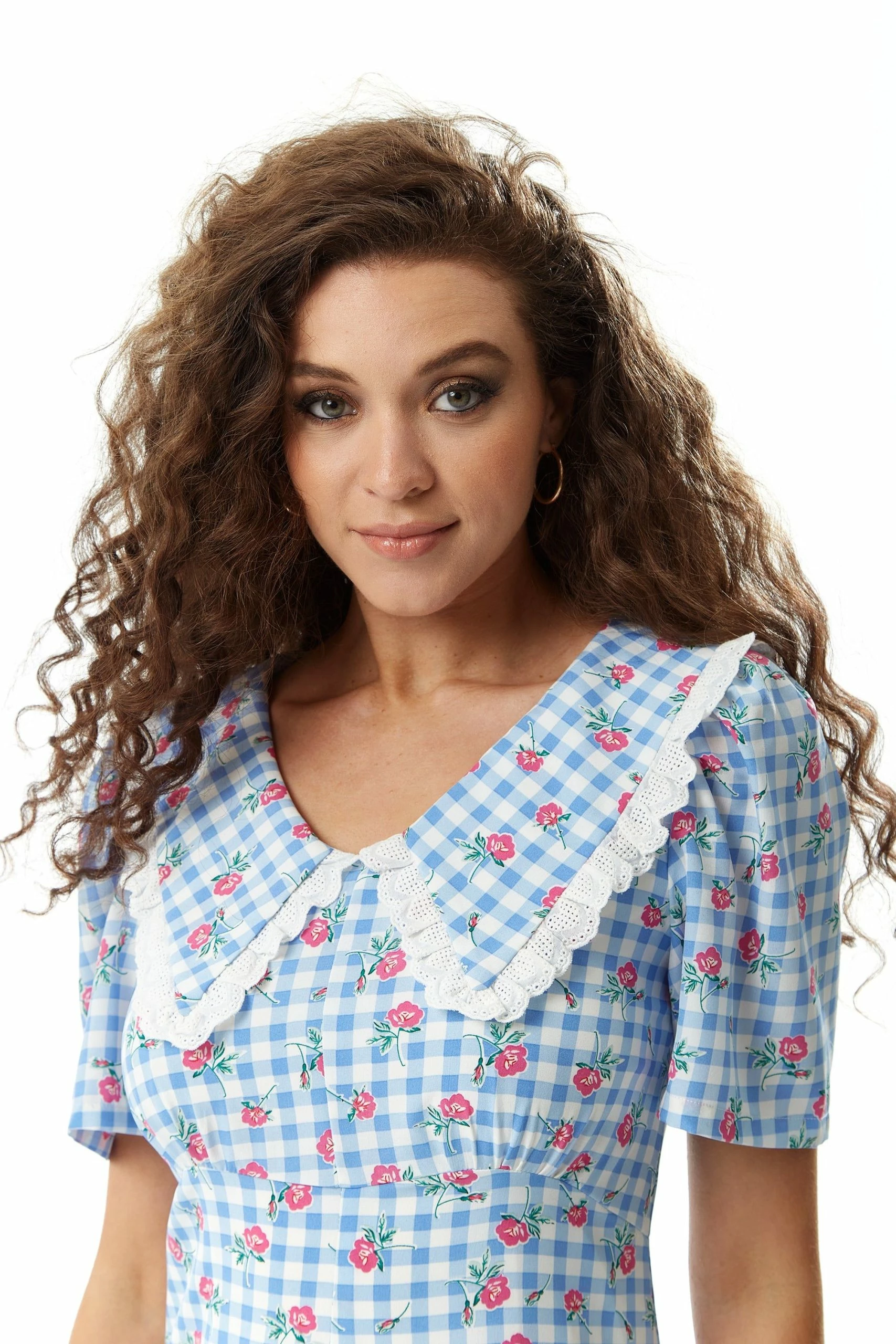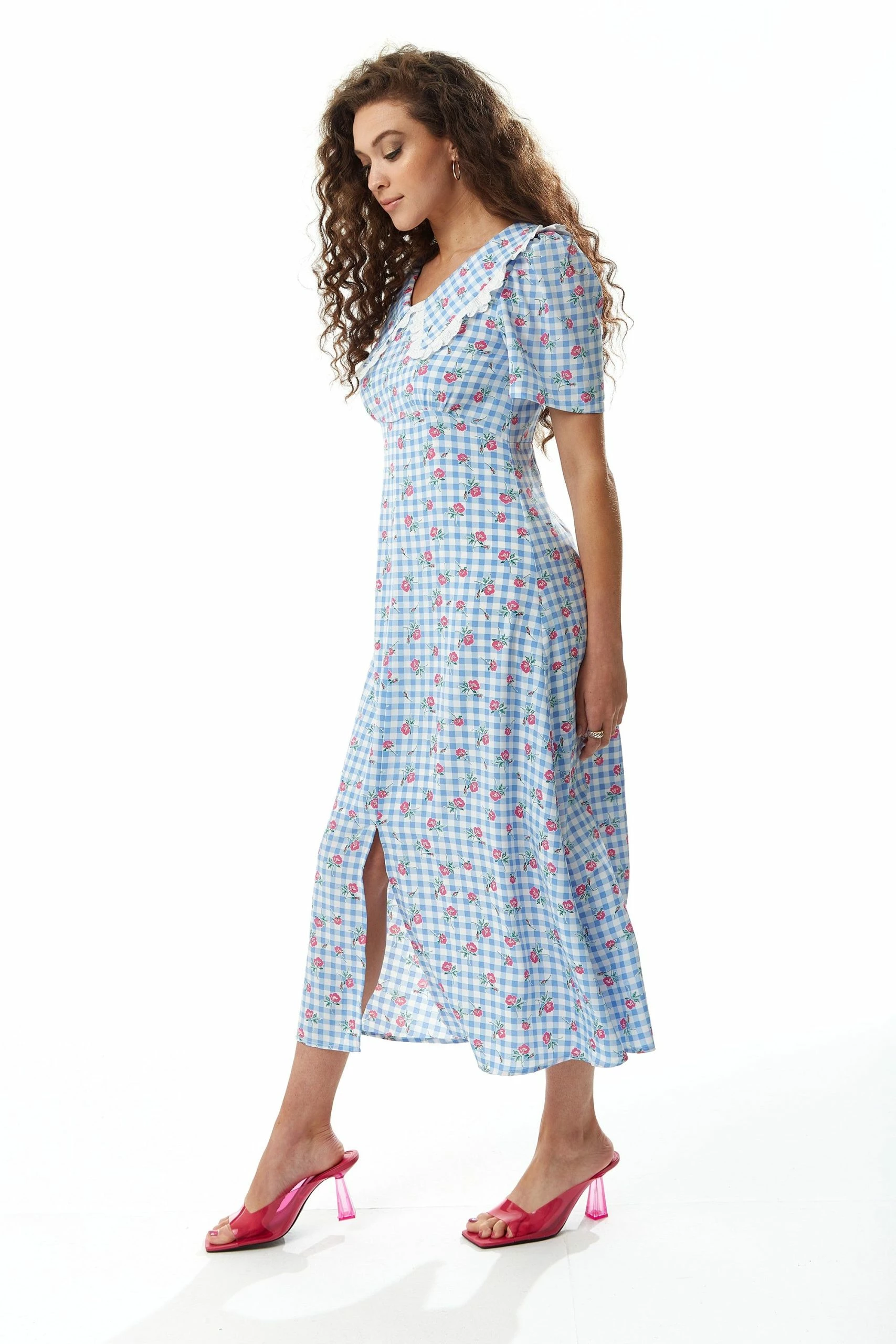 Liquorish Gingham and Floral Midi Dress in Blue and White with Trim Lace Collar