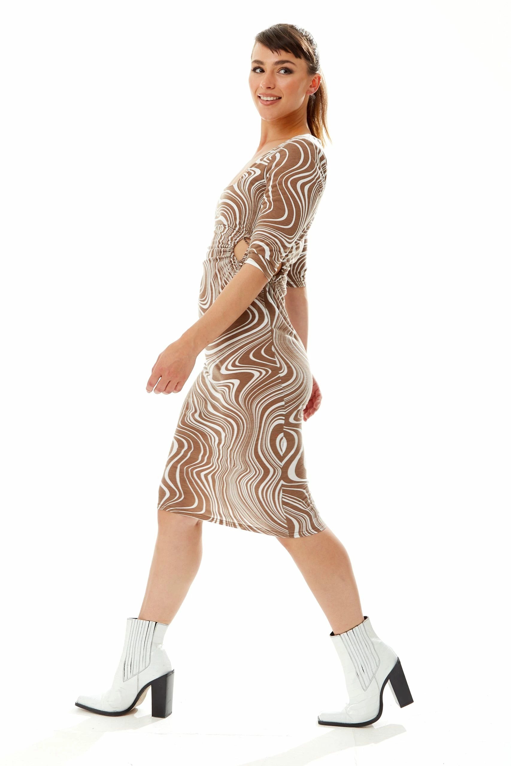 Liquorish Marble Print Jersey Midi Dress with Cut Out Details in Brown
