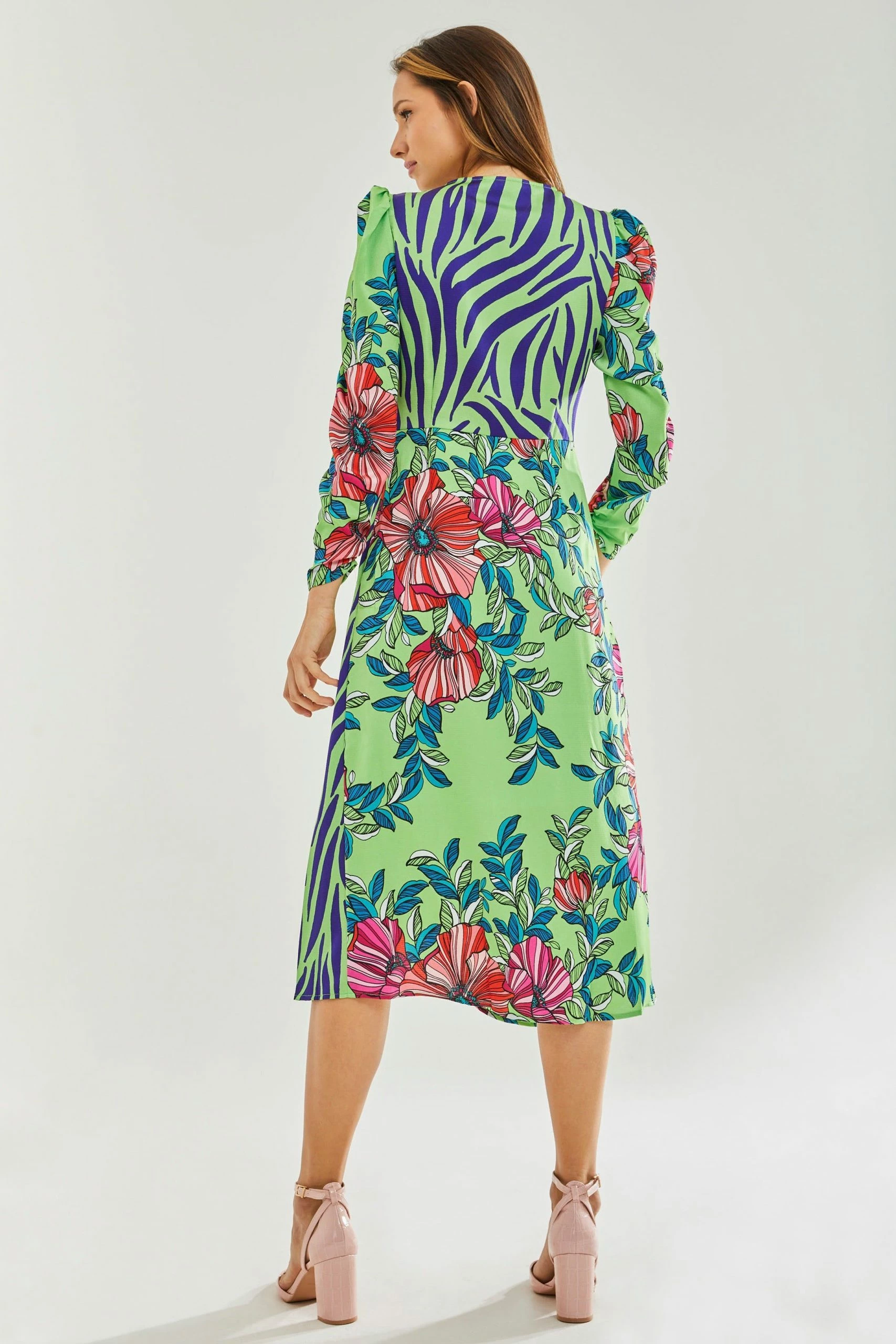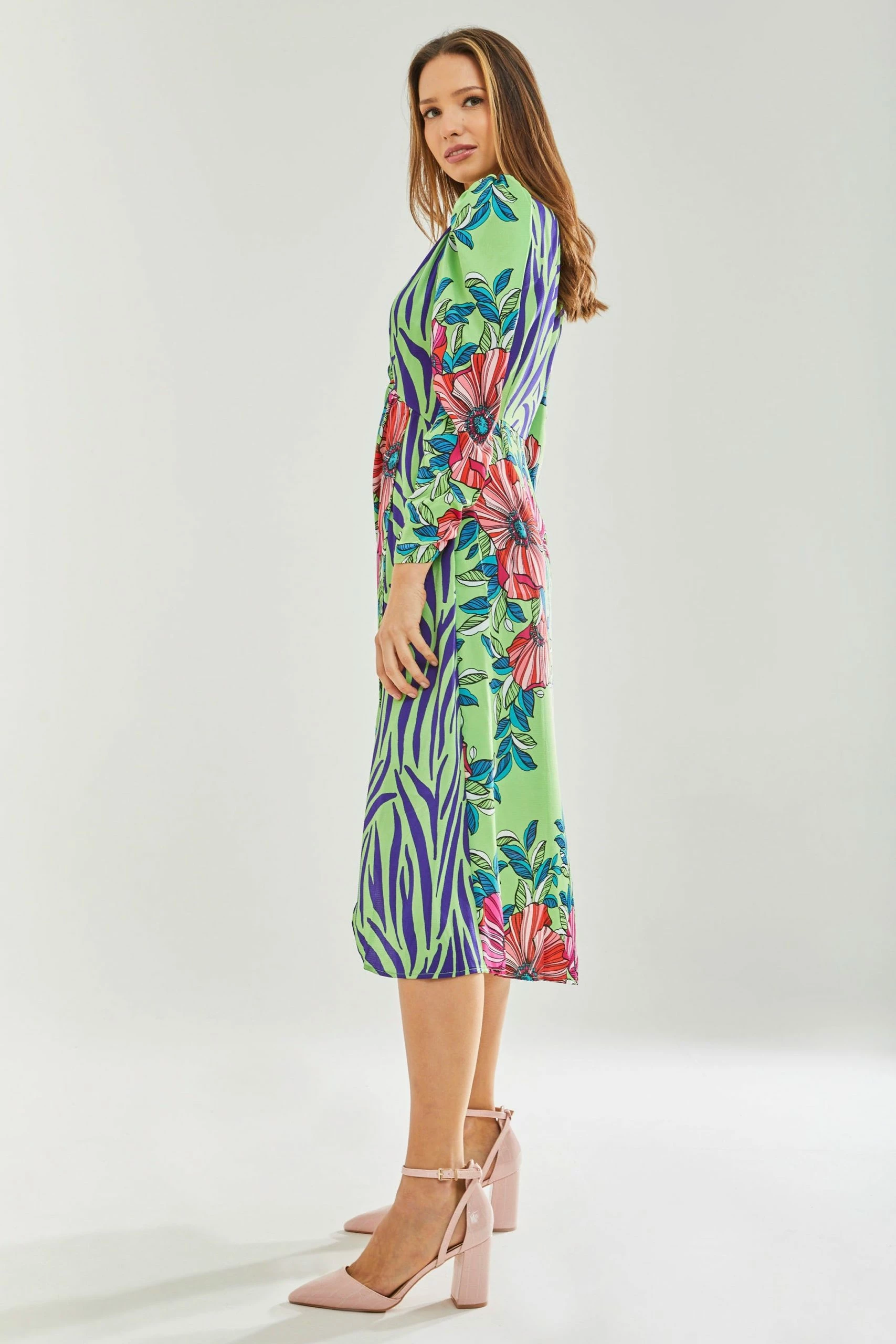 Liquorish Midi Dress in Floral and Animal Contrast Print with Waist Wrap Detail