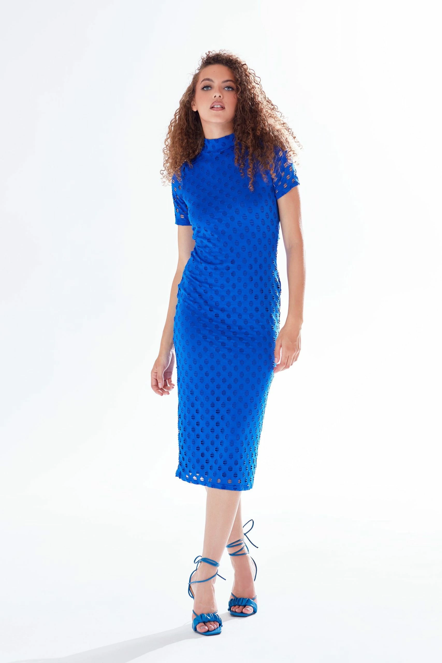 Liquorish Midi Dress with High Neck, Short Sleeves and Open Back Detail in Blue