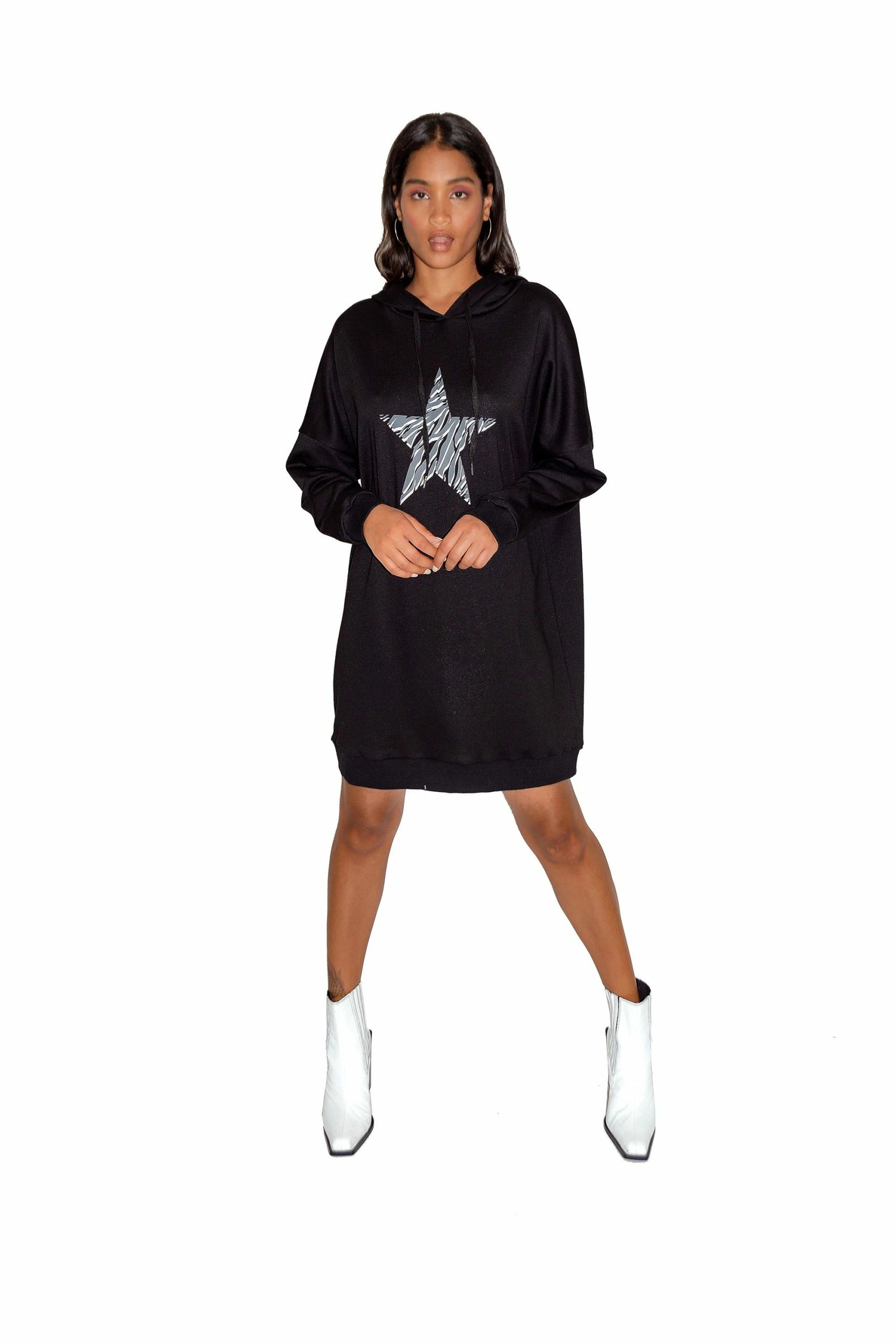 Liquorish Star Print Oversized Loungewear Hoodie Dress in Black