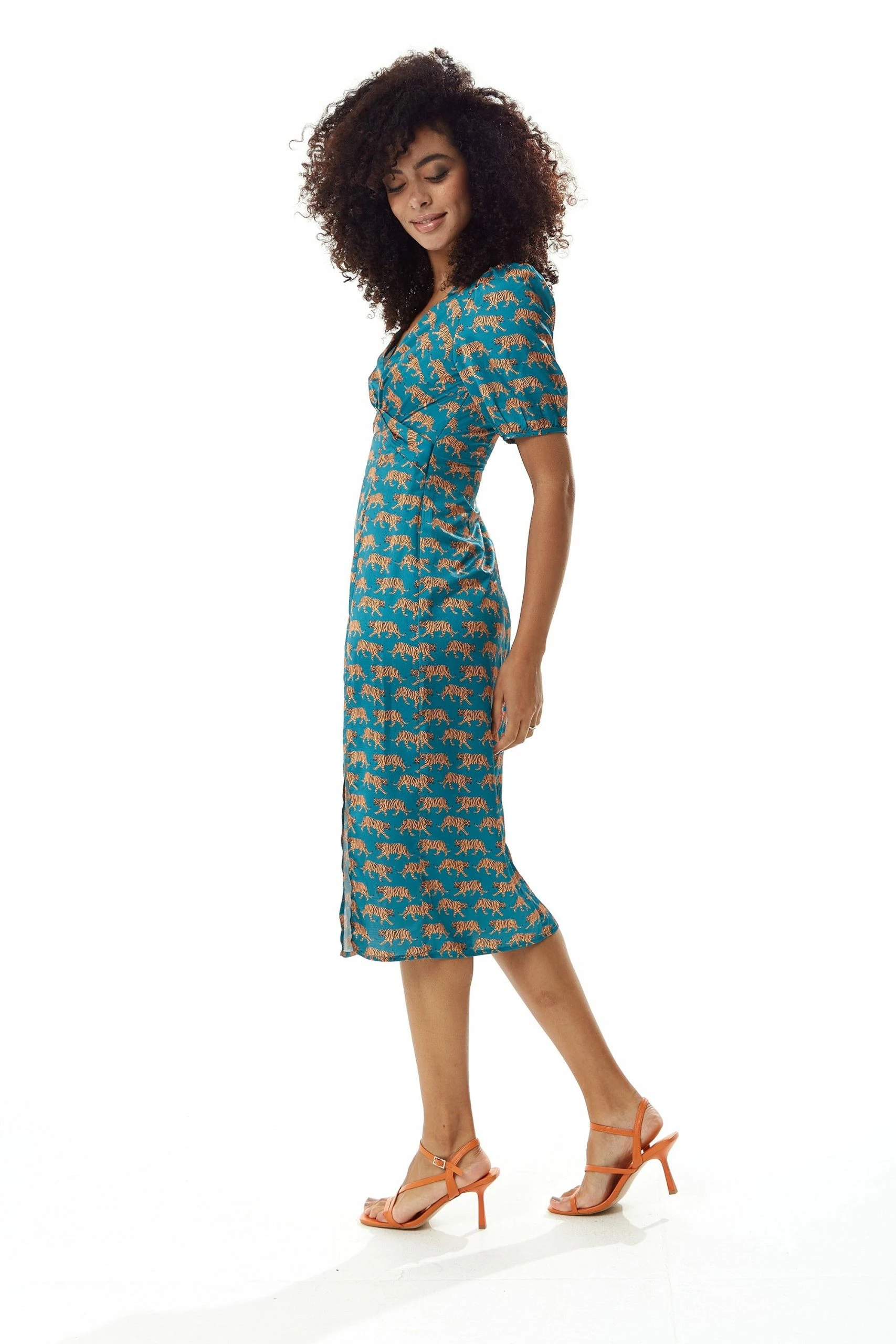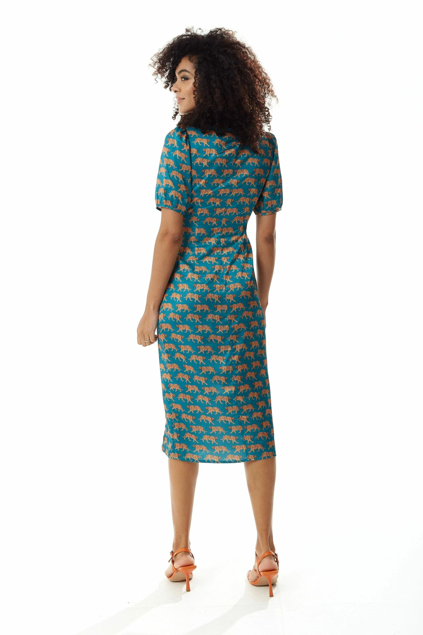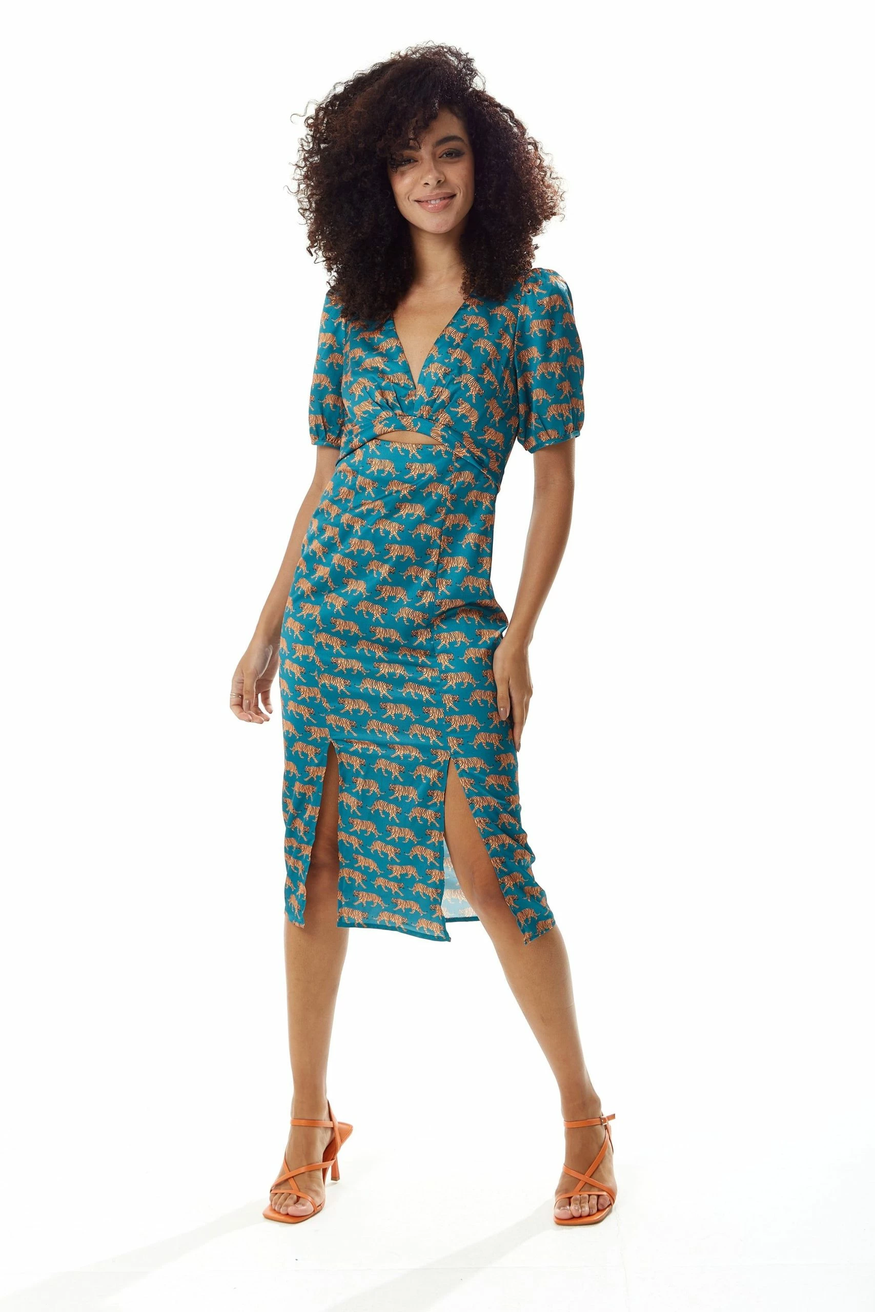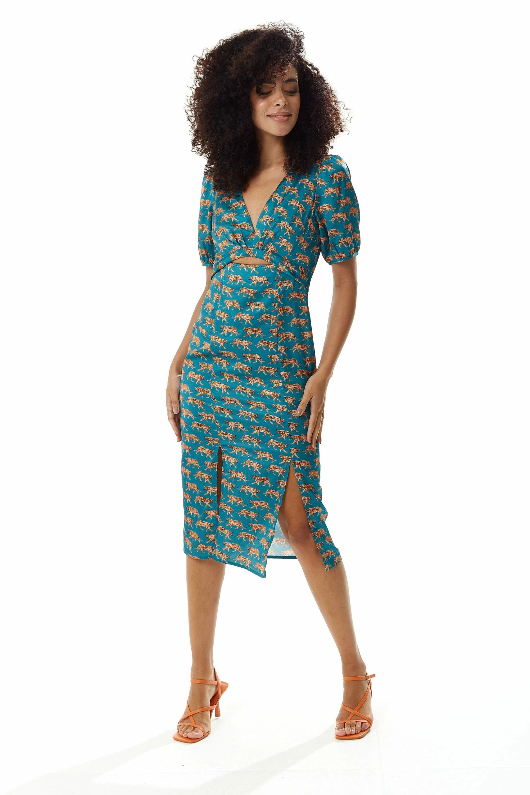 Liquorish Tiger Print Midi Dress with Cut Out Front in Petrol Blue